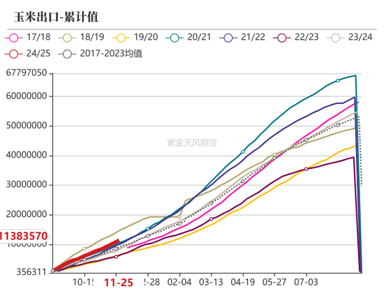 12月6日当周,美国2024/2025年度玉米出口净销售为173.2万吨,前一周为106.3万吨,环比增加66.9万吨;美玉米出口量总量1138.4万吨,未交割销售量2280.8万吨。