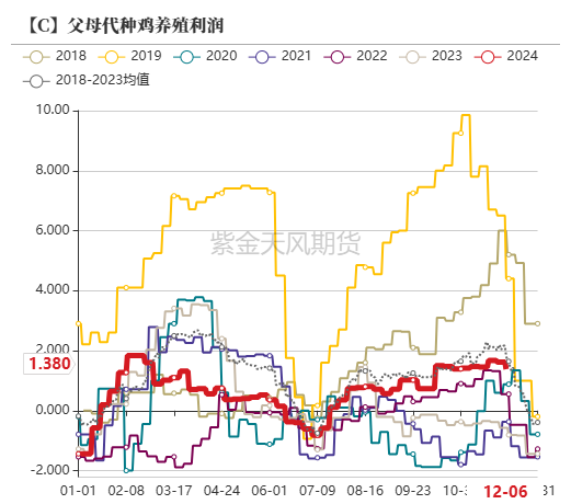 截止12月6日当周,毛鸡周度养殖利润-1.67元/只,上周-1.58元/只,较上周下降0.09元/只。父母代种鸡周度养殖利润1.38元/只,上周1.62元/只,较上周下降0.24元/只。蛋鸡周度养殖利润为62.33元/只,较上周上涨10.3元/只。