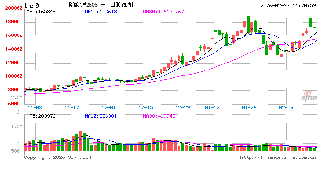 文华财经数据显示,26日收盘时,碳酸锂期货市场沉淀资金达365.32亿元,26日当天资金净流入16.40亿元,成为当日商品期货市场资金流入量最大的品种。此前一天,春节后首个交易日,碳酸锂市场已经大幅上涨。2月25日,碳酸锂主力合约盘中涨幅一度扩大至6.48%,触及17.14万元/吨高点。