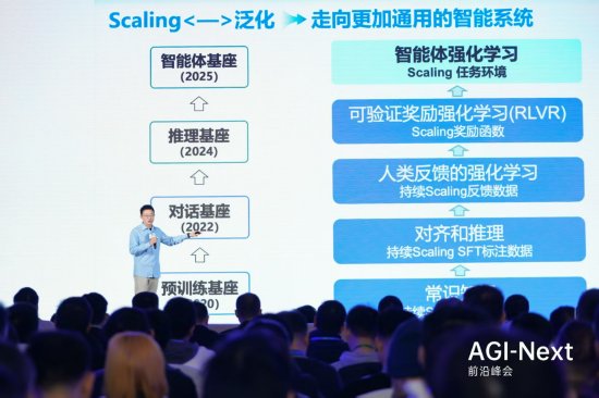 唐杰指出,2020年,AI大模型还只能解决MMU、QA等基础问题;到2021-2022年,通过后训练开始具备数学推理(加减乘除)能力,补齐基础推理短板;2023-2024年,大模型从知识记忆升级至复杂推理,开始可应对研究生阶段问题及SWE bench真实编程任务,类似人类从小学到职场的能力成长过程;而在2025年,模型在人类终极测试中能力快速提升,该测试包含谷歌无法检索的极端冷门问题,需要模型具备强泛化能力。