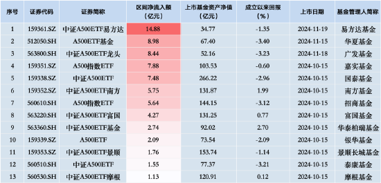 Wind数据显示,截至11月19日,已上市的13只中证A500ETF规模已超1400亿元。从资金流入来看,截至11月19日,中证A500ETF易方达、华夏A500ETF基金、广发中证A500ETF龙头净流入额居前,分别为14.88 亿元、8.98亿元、8.44亿元。