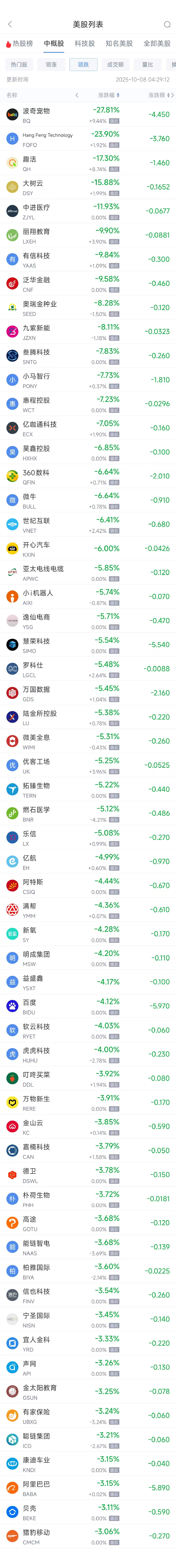 领跌中概股列表: