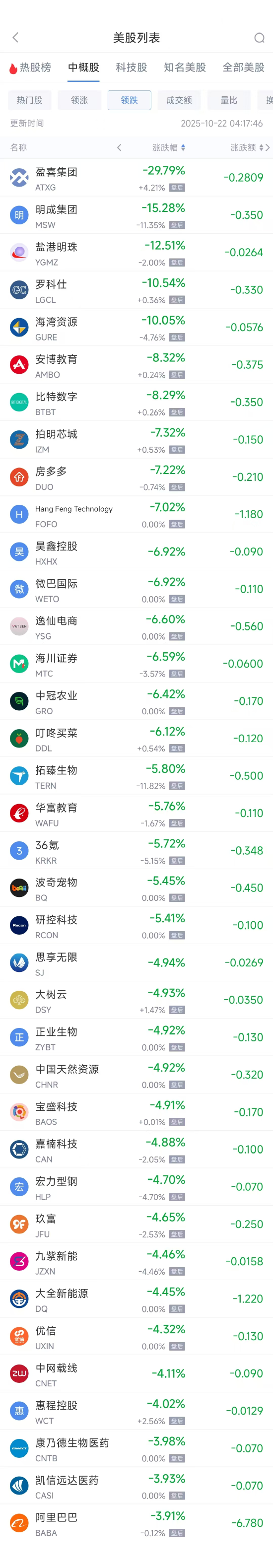 下跌股当中(按市值从高到低),台积电跌1.07%,阿里巴巴跌3.91%,拼多多跌0.65%,网易跌0.65%,京东跌2.75%,携程跌0.04%,百度跌2.44%,中华电信跌1.08%,日月光半导体跌2.42%,理想汽车跌2.35%,贝壳跌1.34%,联电跌1.00%,蔚来跌3.54%,中通跌0.52%,满帮跌1.58%,华住酒店集团跌0.52%,中国新城农村跌6.34%,BOSS直聘跌0.99%,唯品会跌2.00%,小马智行跌1.99%,名创优品跌2.80%,万国数据跌0.76%。